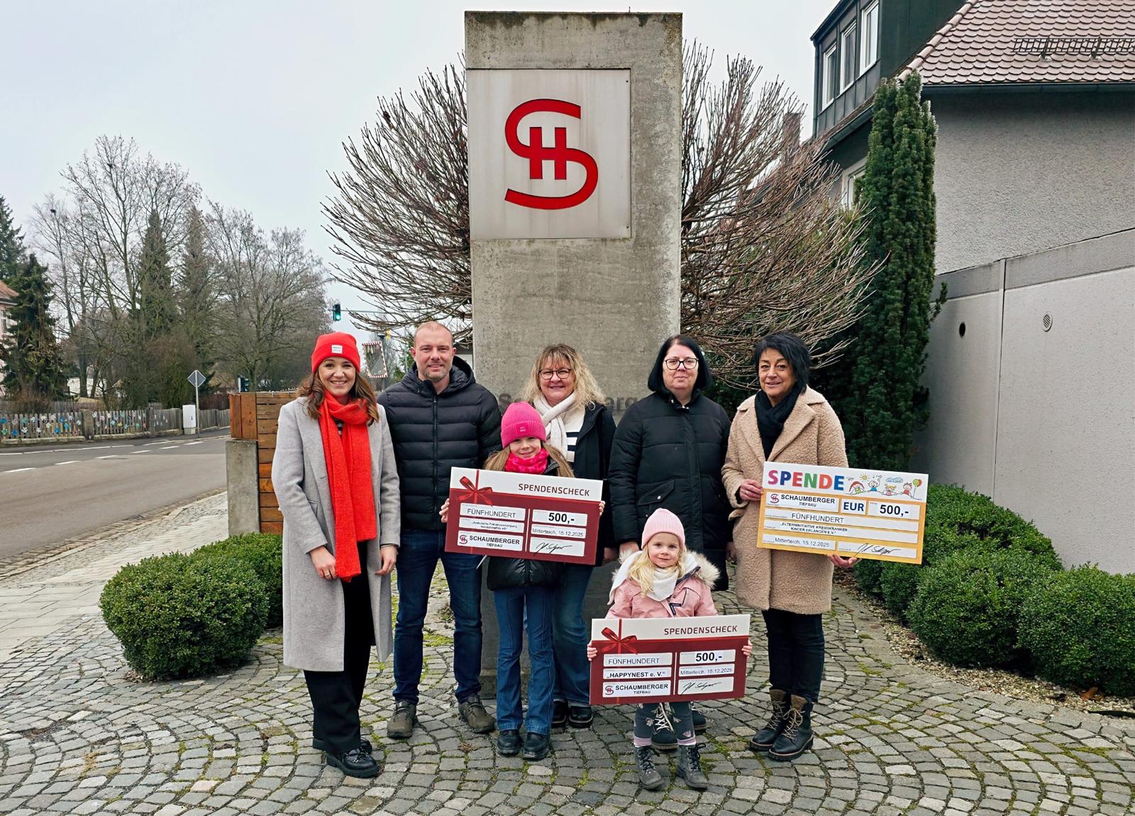 Dr. Margarete Pickert und Diakon Matthias Rössle von der SAPV freuen sich über die Spende, die Marion Forster und Bernhard Schön jun. (v.l.) von der Geschäftsleitung überreichen.